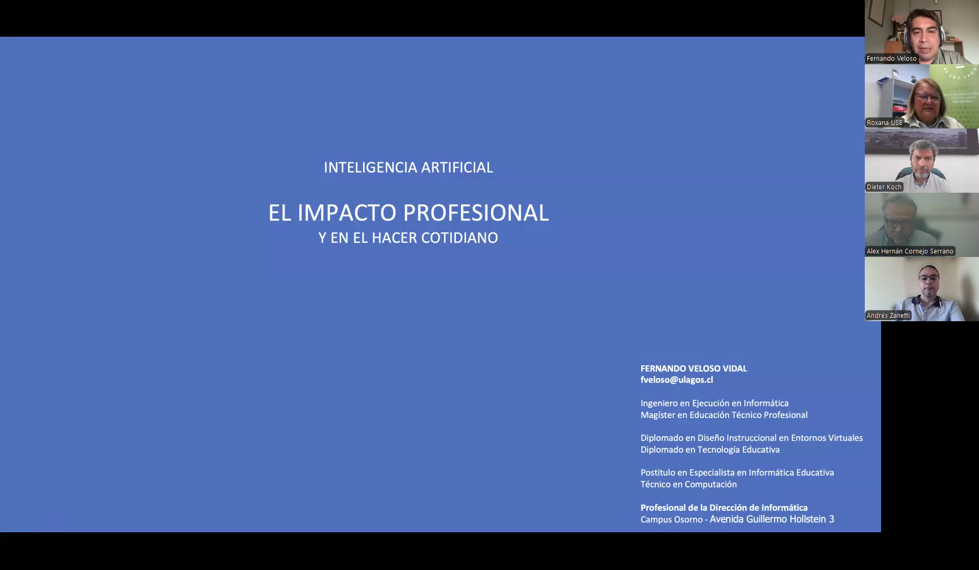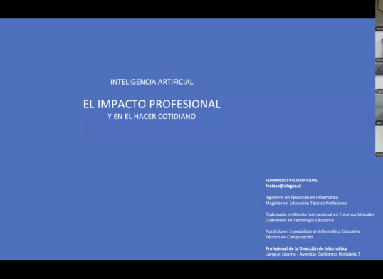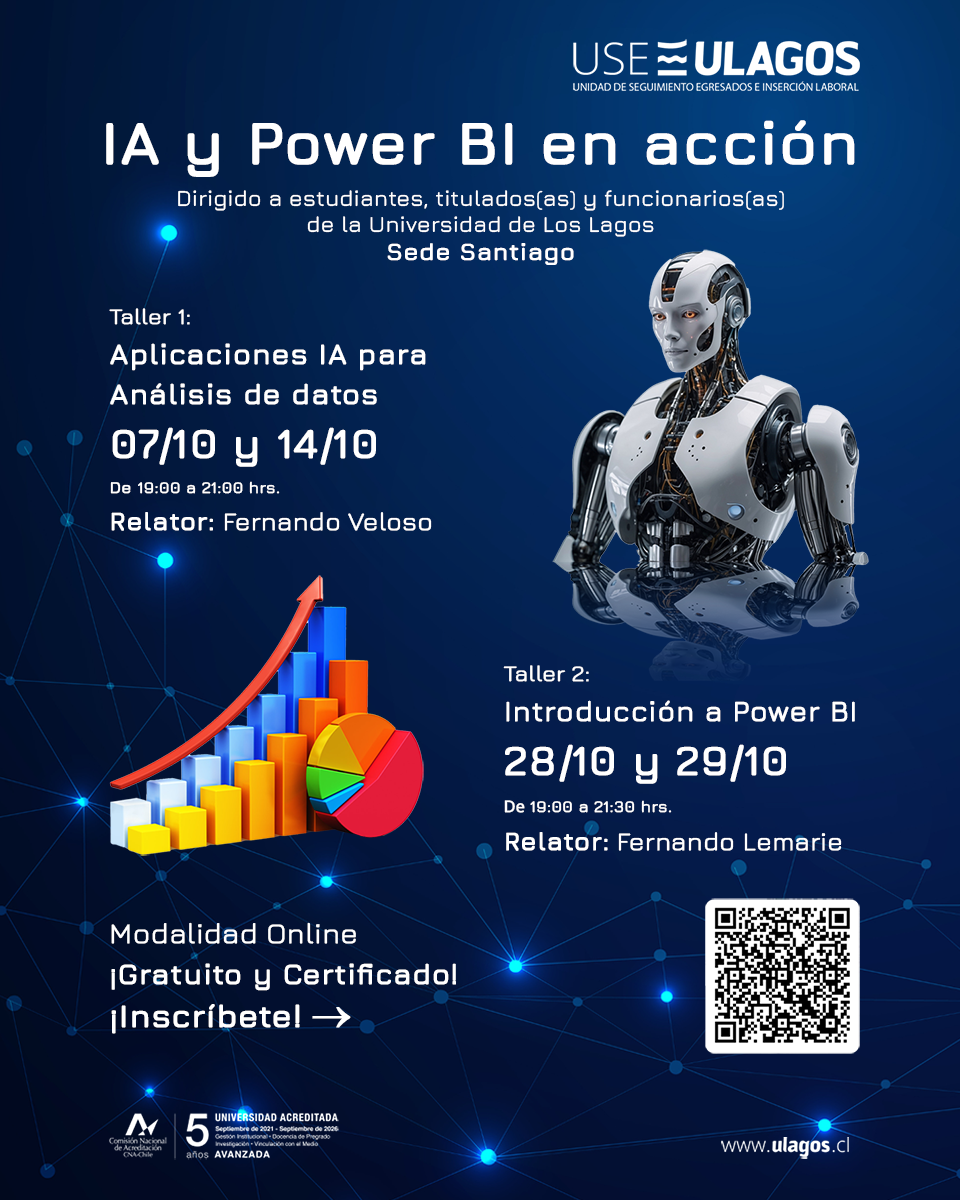 Con una emotiva ceremonia virtual, la Universidad de Los Lagos -a través de la Unidad de Seguimiento de Egresados (USE) de la Sede Santiago- dio inicio este 7 de octubre al Ciclo de Talleres “IA y Power BI en acción”, una instancia formativa gratuita y certificada que busca fortalecer los vínculos con sus egresados, potenciar su empleabilidad y actualizar competencias en tecnologías emergentes.